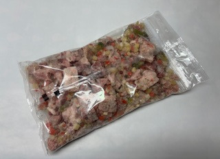 Muskelfleisch, Hühnerhälse, Leber, Herz, Hühnerfett, Mägen, Pastinake, Möhre, Zucchini, Brokkoli, Apfel, Johannisbeere, Lachsöl, Seealgenmehl